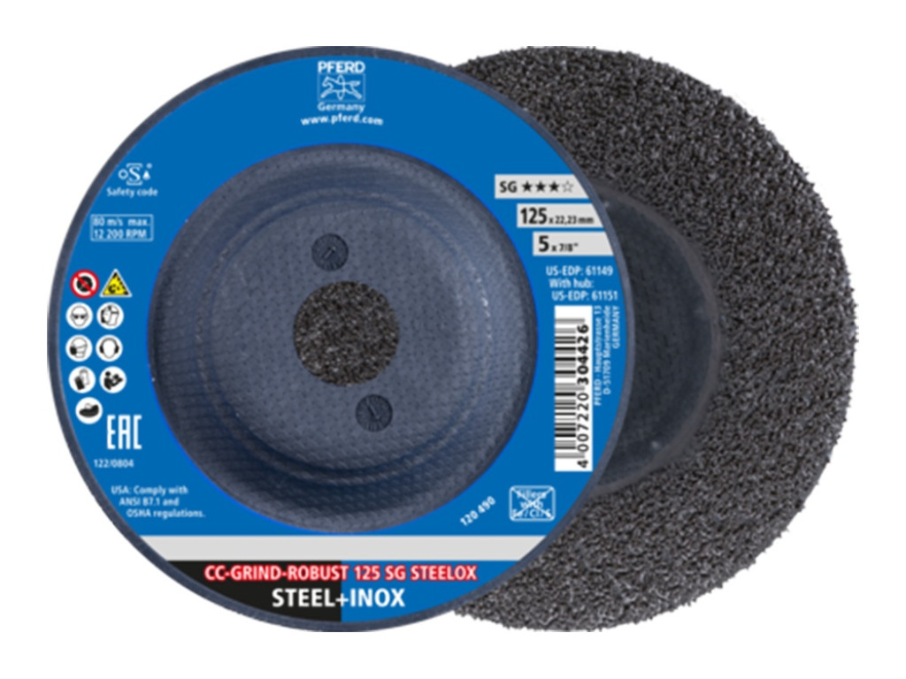 PFERD CC-GRIND-ROBUST SG Steelox - 125 mm is geschikt om RVS en INOX te bewerken. Ideaal voor lasnaadbewerking, ontbramen, vlakslijpen en schuinkanten. Voor optimaal rendement kunt u de vlakke aanzethoek gebruiken. Deze slijpschijven hebben een hoge standtijd en slijpvriendelijkheid.