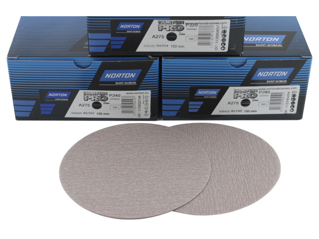 De Norton Pro A275 schuurschijven 150mm met velcro bevestiging zijn leverbaar in diverse korrelgroftes (VPE: 100 st.):