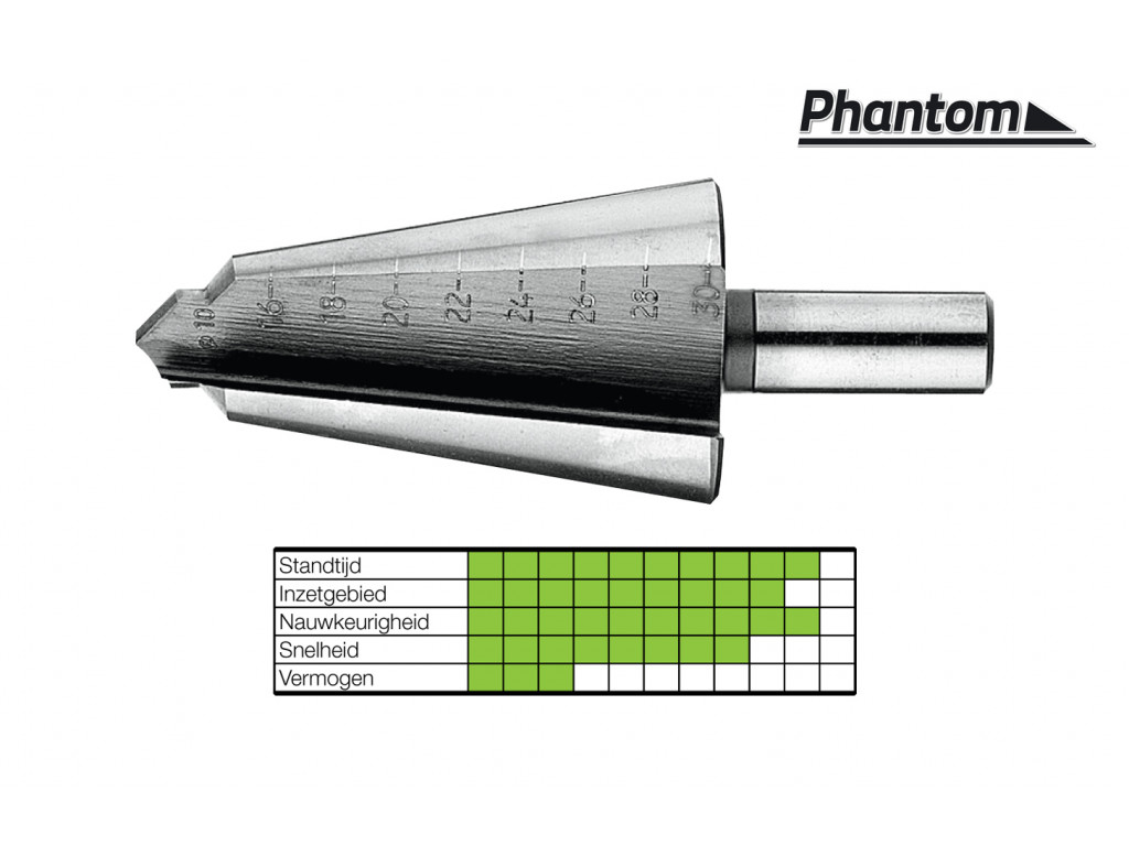 De Phantom HSS conische boor / plaatfrees (44.200) is uitgevoerd met een cilindrische schacht. De plaatfrezen zijn allen voorzien van diameter markering.