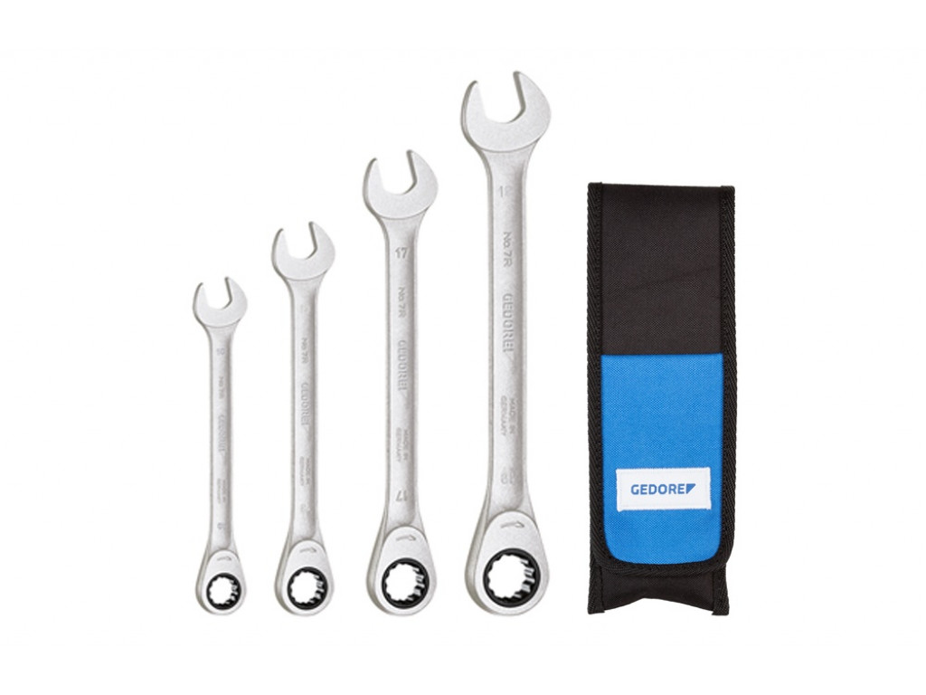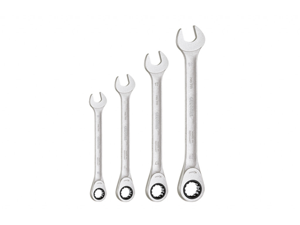 GEDORE S 7 R-04 Ringratel-steeksleutelset, is een 4-delige set met robuuste en krachtige ringratelsleutels: