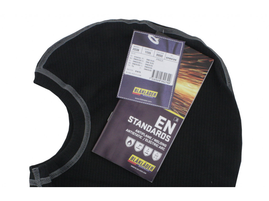 De Blåkläder Balaclava 2038 beschermt uw hoofd, nek en keel tegen weersinvloeden als kou, wind en tocht. Daarnaast biedt het bescherming tegen vuil en niet in de laatste plaats las- en slijpspatten, dankzij de vlamvertragende eigenschappen. Aan de buitenzijde zijn de normeringen (EN 11612 Vlamvertragend, EN 1149-5 Elektrostatische oplading, EN 61482-1-2 Elektrische vlamboog) goed zichtbaar. Ideaal, want zo zien functionarissen in één oogopslag dat u aan de veiligheidsnormen voldoet.