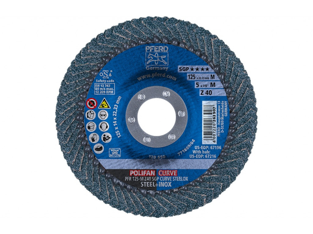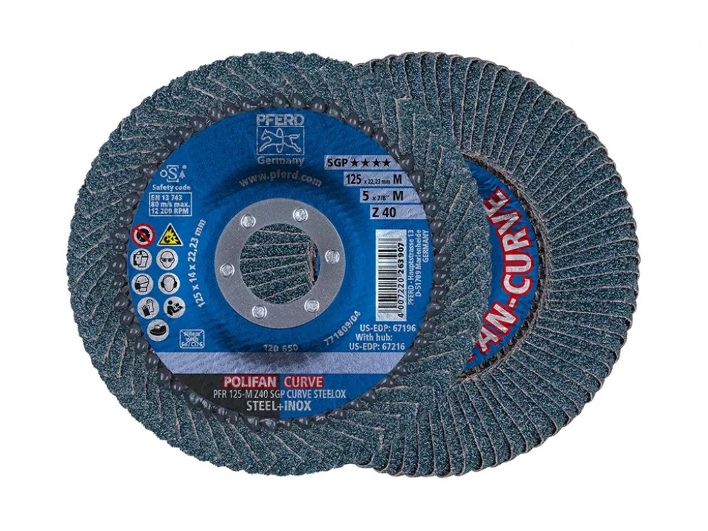 PFERD Polifan Curve Lamellenschijf - Z40 SGP 125 mm. Curve schijven met zirkonium slijpkorrel, bij uitstek geschikt voor hoeklasnaden slijpen.