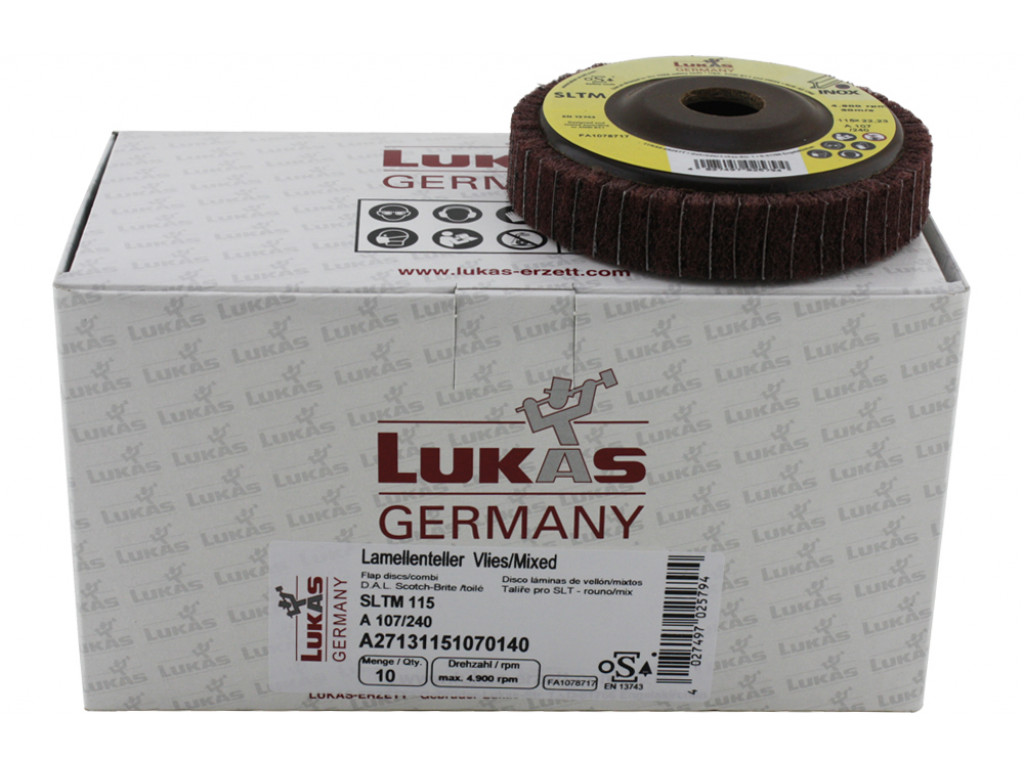 De Lukas SLTM vlies / linnen is een unieke lamellenschijf. Deze schijf is bij uitstek geschikt voor het finishen en lichte materiaalafname op o.a. Non-Ferro, RVS en aluminium. De Lukas SLTM 115 – A106 / 150 heeft een mix van schuurlinnen en vlies (Scotch-Brite), waar in beide materialen slijpkorrels verwerkt zitten.