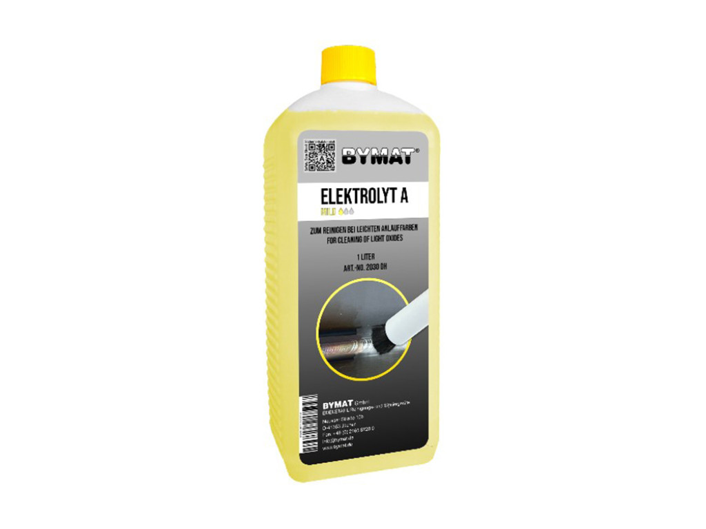 De Bymat Elektrolyt A – 1 liter is een milde, gebruiksklare elektrolyt voor het reinigen van RVS-lasnaden na TIG- en MIG-lassen.