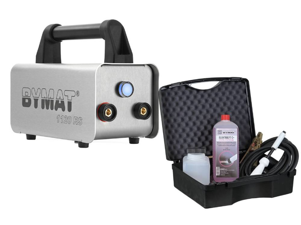De Bymat 1120 RS RVS lasnaadreiniger wordt geleverd met de Brushline 1120 ES starterset, met alle benodigde toebehoren en elektrolyt C+ vloeistof in een handige koffer. Elektrolyt C+ is een extra sterke reinigingsvloeistof, geschikt voor het reinigen / polijsten van RVS lasnaden met sterke verkleuring, zware oxidatie of ernstige aanslag.