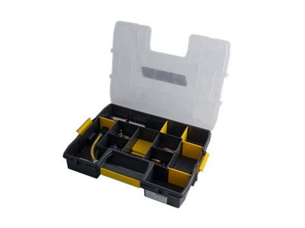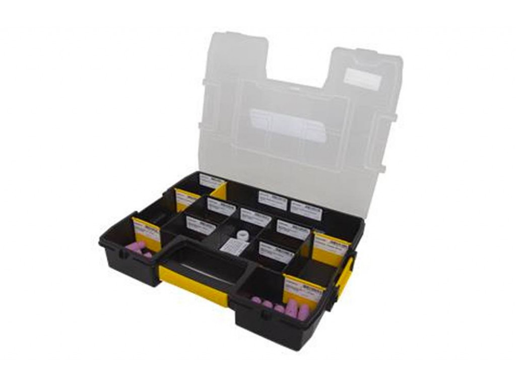 De Weldkar assortimentskoffer WK 140 – 150 is gevuld met veel gebruikte MIG-toorts onderdelen. De koffer is overzichtelijk, praktisch en gemakkelijk mee te nemen. De assortimentskoffer bestaat uit 12 vakken die u naar eigen wens kunt inrichten. In de koffer zitten MIG-toorts onderdelen, zoals contacttip, contacttiphouder, gasmondstuk en zwanenhals.