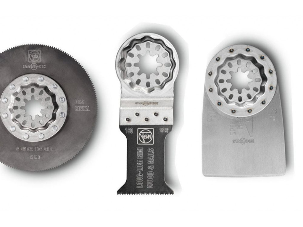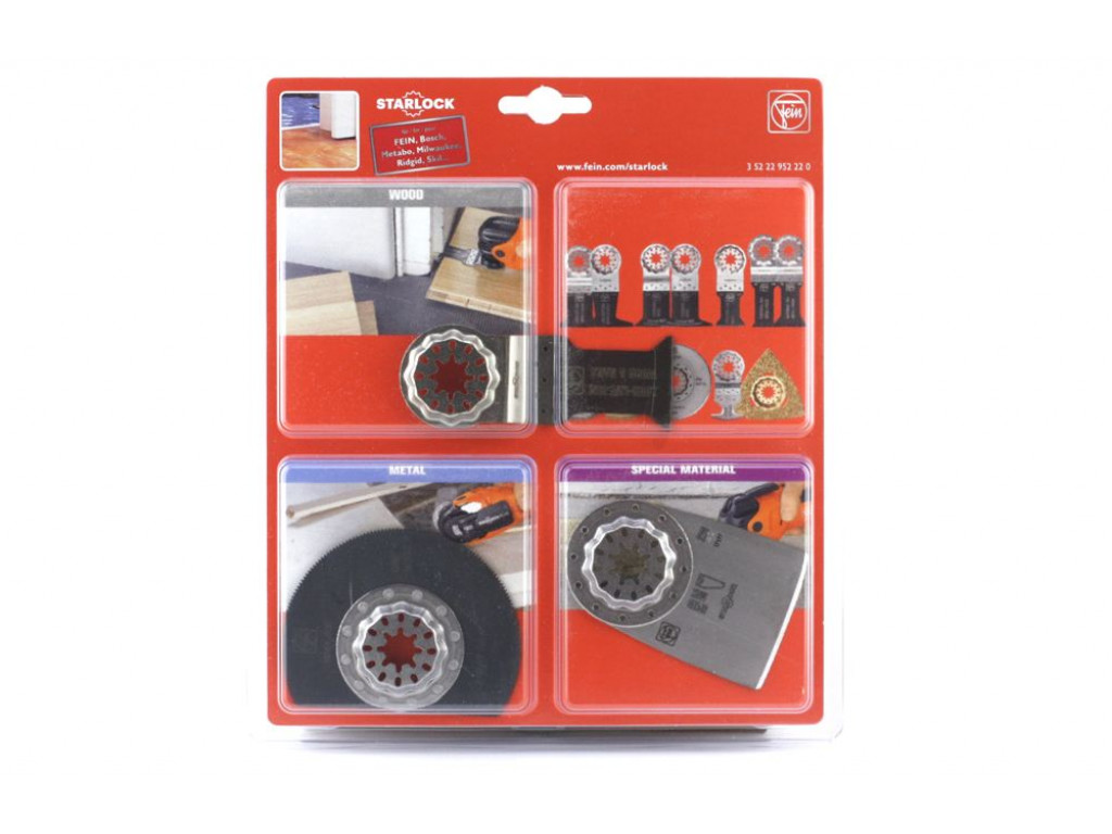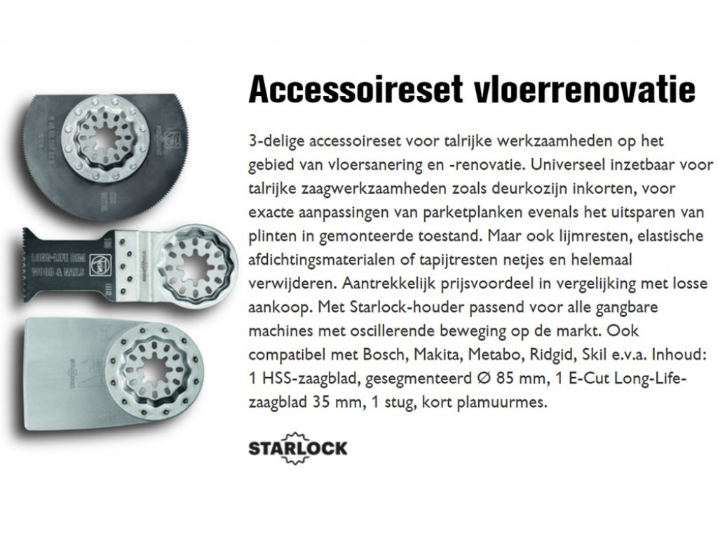 Deze 3-delige set omvat gereedschappen voorzien van een Starlock-houder. Hiermee passen deze acceesoires op alle gangbare machines met oscillerende beweging. Denk hierbij - naast FEIN - bijvoorbeeld aan Bosch, Makita, Metabo, Ridgid en Skil. De set (35222967110) bestaat uit de volgende accessoires: