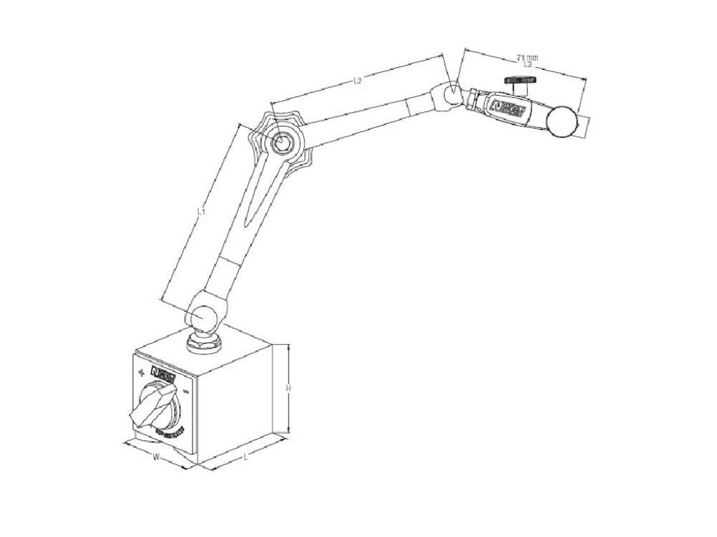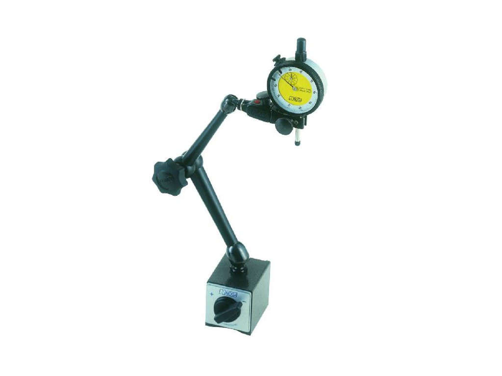 Het DG61003 statief is een uitstekende aanvulling op de DG 1000 meetklok, dankzij zijn flexibiliteit, stabiliteit en gebruiksgemak. Voor optimale stabiliteit heeft het statief een krachtige magneetvoet met een trekkracht van 800N. Deze magneetvoet is voorzien van een aan/uit-schakelaar, zodat hij snel en gemakkelijk bevestigd en verwijderd kan worden. De ingebouwde fijninstelling zorgt ervoor dat de meetklok in alle richtingen nauwkeurig en flexibel kan worden afgesteld, wat essentieel is voor precisie-instellingen. Het statief heeft een lengte van 110 + 101 mm en ondersteunt een boorbereik van 0,2 tot 1,5 mm, zodat hij breed inzetbaar is voor diverse metingen.