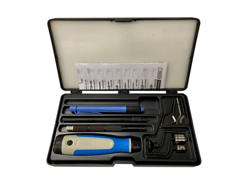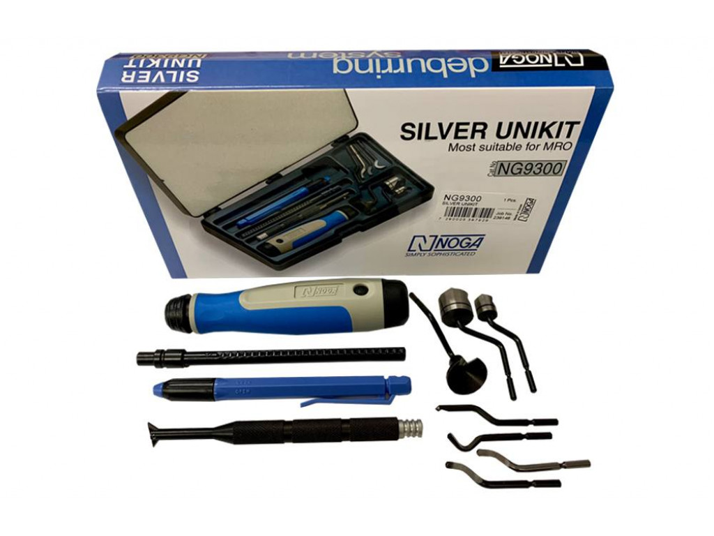 De Noga NG 9300 Unikit Zilver is zeer uitgebreide ontbraamset met diverse houders en mesjes. Naast het universeel ontbramen (roterende mesjes), zitten er ook een aantal verzinkers in deze set. De Unikit Zilver bevat verschillende mesjes, voor het ontbramen van zowel de voor- als achterzijde van gaten.
