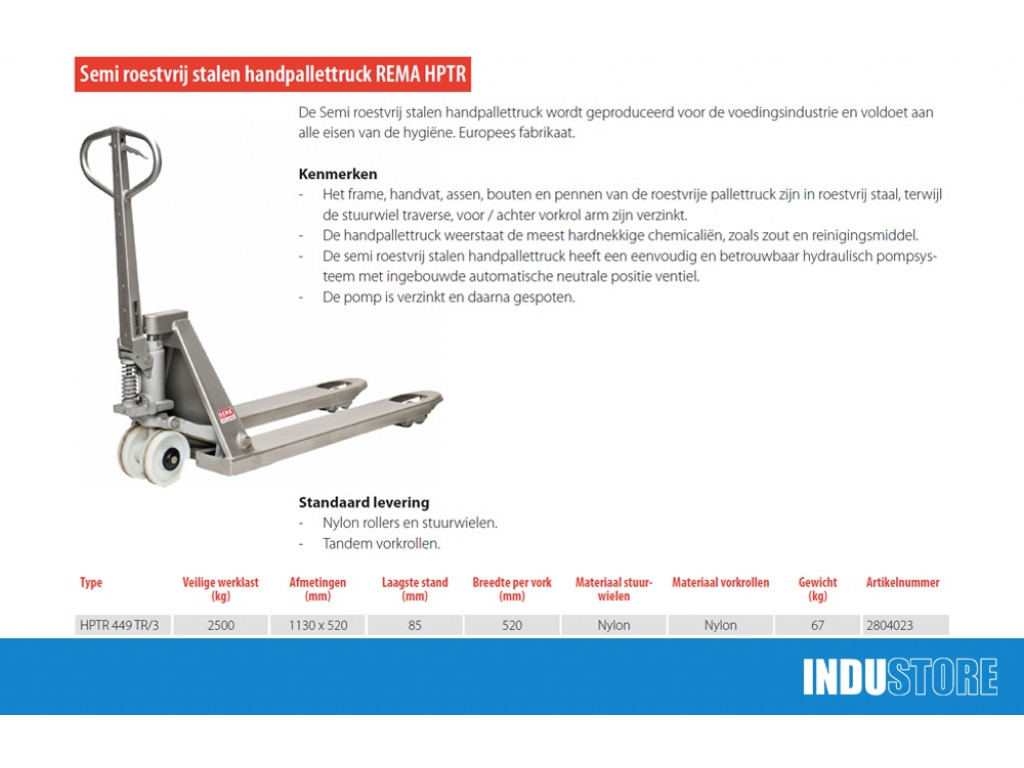 De REMA HPTR palletwagen is een semi RVS pompwagen die geproduceerd is voor o.a. de voedingsmiddelen industrie, waar hoge eisen worden gesteld aan hygiëne. De onderdelen van deze palletwagen zijn van RVS of verzinkt. Hierdoor is deze pompwagen zeer corrosiebestendig en ideaal in bijv. vochtige omgeving in de voedingsmiddelenindustrie.