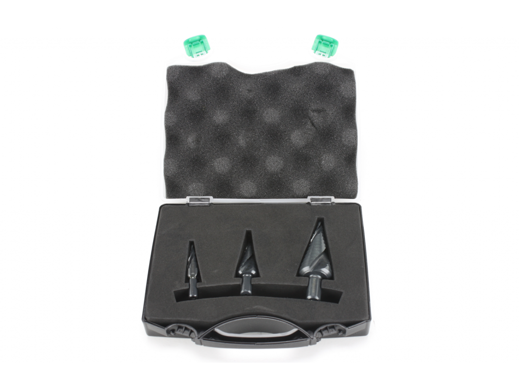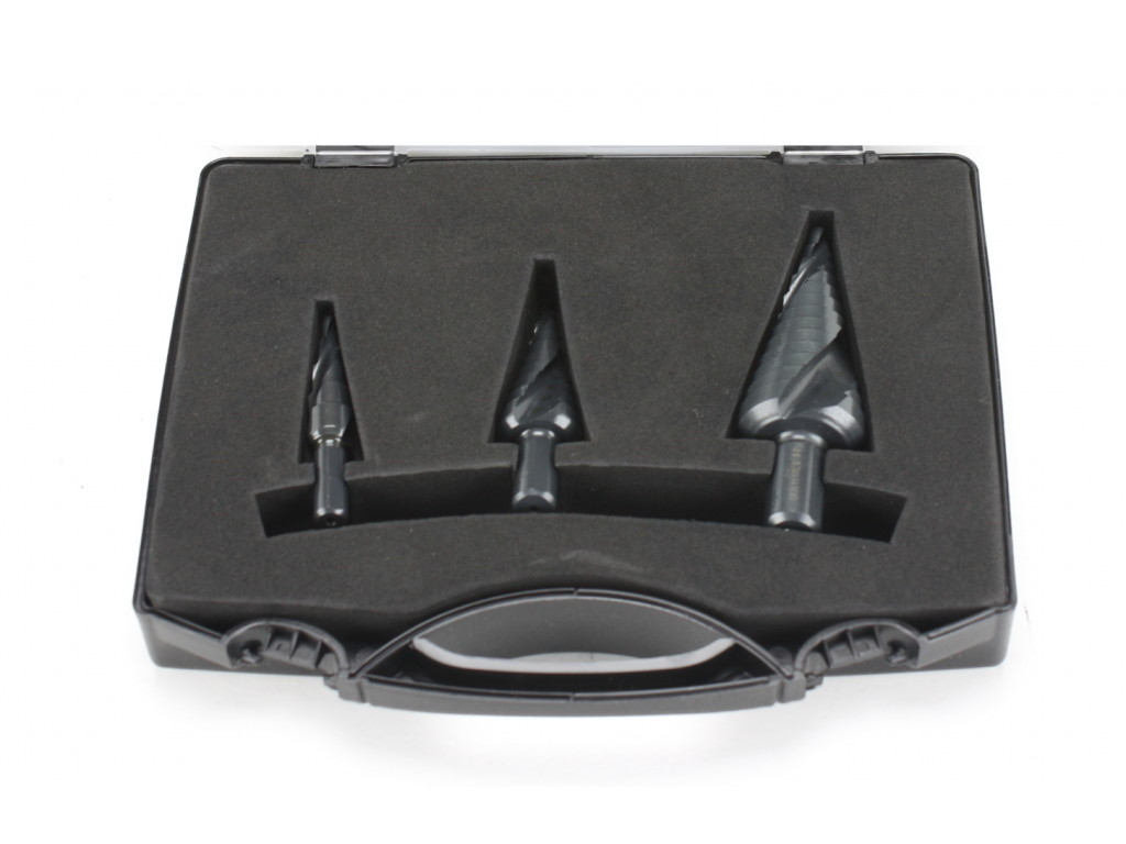 Phantom 3-delige plaatboren set, met HSS trappenboren, genitreerd. De getrapte plaatboren zijn bij uitstek geschikt voor het boren van o.a. dunne materialen en plaatstaal.