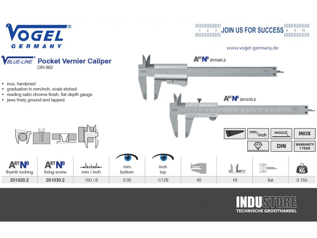 Precisie schuifmaat van Vogel Germany, uitgevoerd met momentklem. Deze professionele schuifmaat is gemaakt van hoogwaardig RVS en voorzien van mm / inch schaalverdeling.