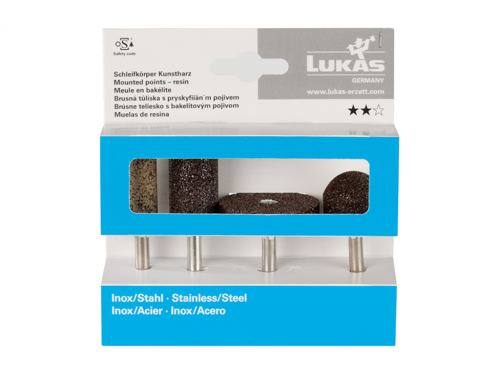 Lukas Stiftstenen set Inox is een 4-delige set, gevuld met hoogwaardige slijpstenen op stift in diverse vormen. De Inox stiftstenen set is ideaal voor het slijpen en polijsten van RVS, gehard staal, hittebestendig staal, gietstaal, gereedschapsstaal, etc.