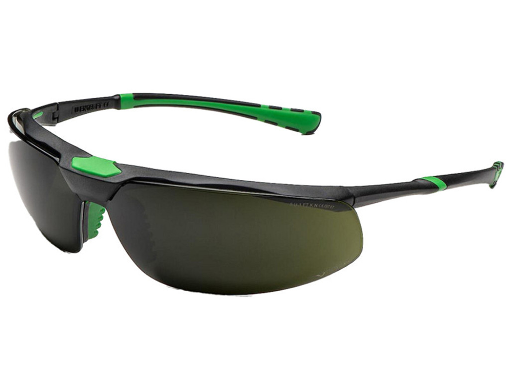 De lens van deze uitvoering is gemaakt van polycarbonaat en uitgevoerd in groen met lastint 5. Dat maakt de bril geschikt voor toepassingen waarbij een donkerdere filtersterkte gewenst is dan bij lichtere laslenzen, terwijl bescherming en werkcomfort centraal blijven staan.