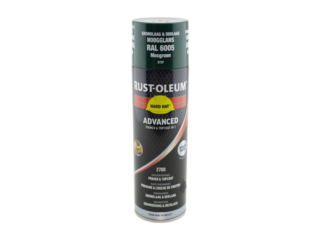 De spuitbus verf Rust-Oleum Hard Hat Advanced 2737 is in de kleur Mos Groen (hoogglans), RAL 6005.