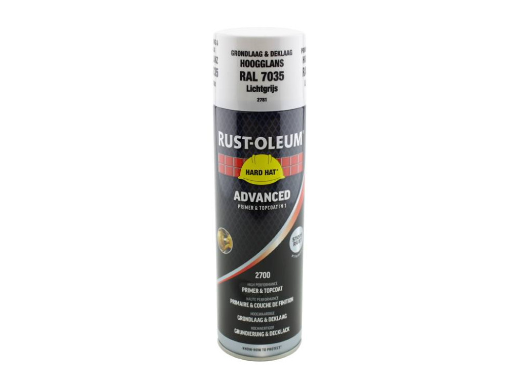 Rust-Oleum Hard Hat Advanced 2781 is een spuitbus verf (500 ml, primer en deklaag in 1), in de kleur Licht Grijs – RAL 7035 (hoogglans). Bekijk ook de overige kleuren en extra informatie over Rust-Oleum Hard Hat Advanced.