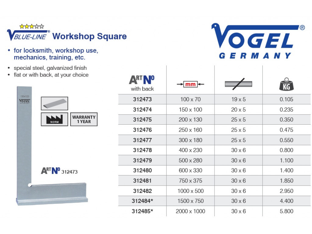 De winkelhaak van Vogel Germany is standaard leverbaar in de volgende afmetingen: