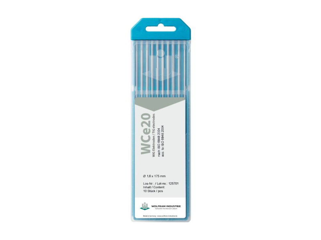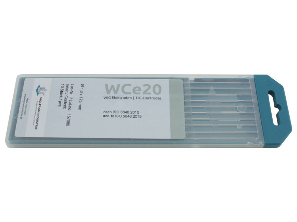 De Wolfram Industrie WCe20 wolfraam elektroden (Grijs) hebben tot 2% cerium oxide gehalte, voor verbeterde ontsteking. Bijkomende kwaliteit kenmerken van Wolfram Industrie zijn onder meer een fijnkorrelige microstructuur, de hoogste materiaal zuiverheid en een homogene verdeling van de oxiden.